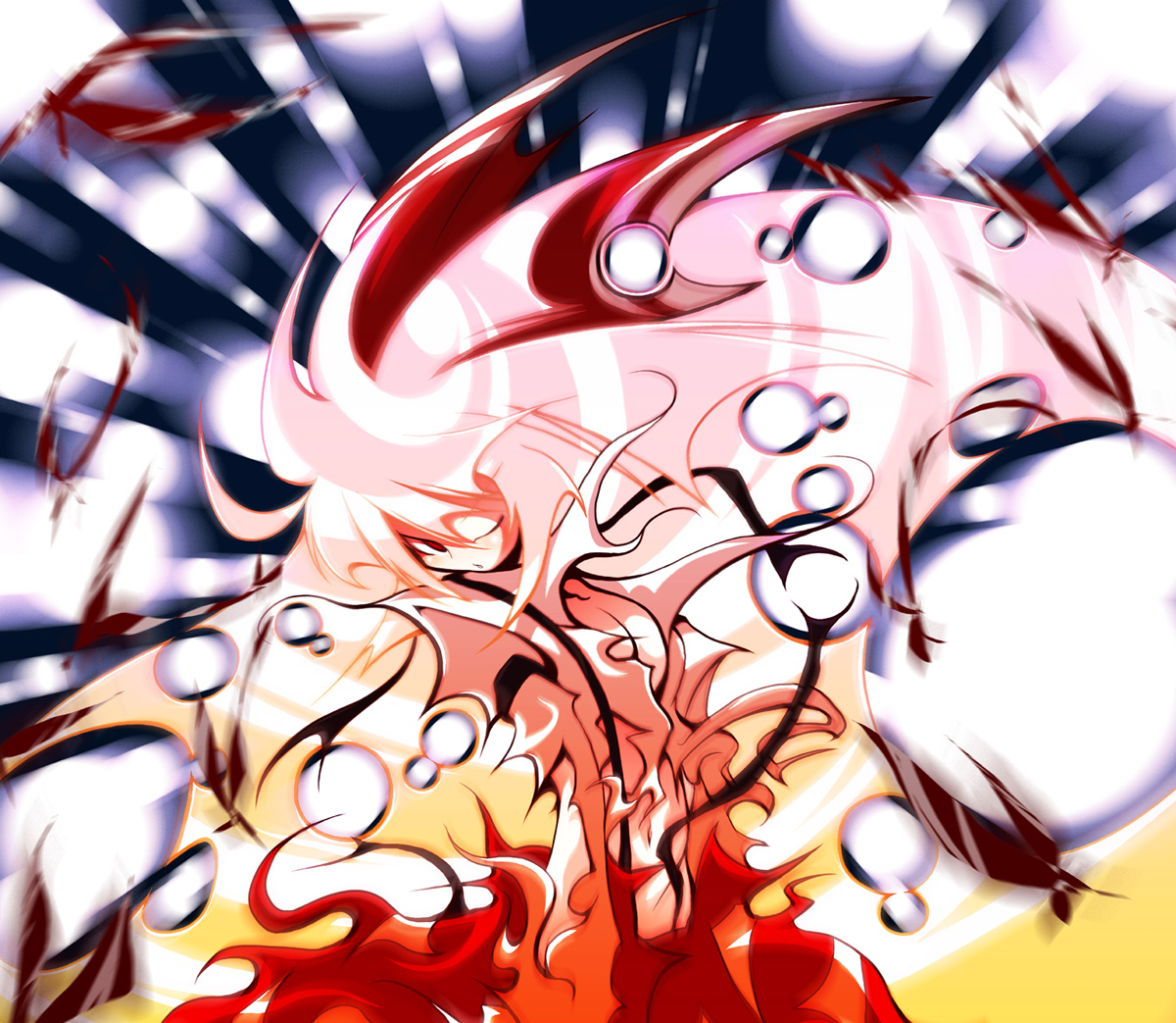 1girlblurrydanmakufemale focusfiregradient backgroundlong hairmotion blurnavelone eye closedred eyessolosuspenderstorn clothesvery long hairwink