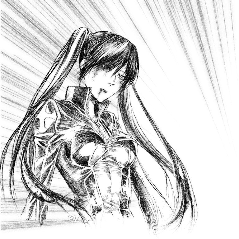 1girlblack hairblack jacketblack order uniformbloodblood from mouthbreastsbruisebruise on faceclosed mouthcrossexpressionlessfront zippergreyscalehair between eyesinjuryjacketlong hairlooking downmedium breastsmonochromesidelockssketchsolotwintailsvery long hair