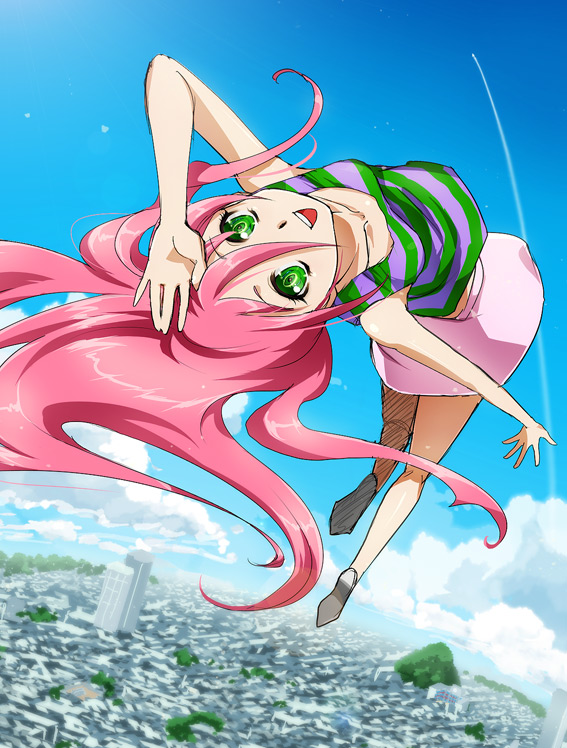 1girlandroidaqua eyesblue skycityscapecloudcontraildayfemale focusflyinggreen eyeslooking at viewerlooking backminiskirtopen mouthoutdoorspink hairrobotshirtskirtskysolostriped clothesstriped shirttank top