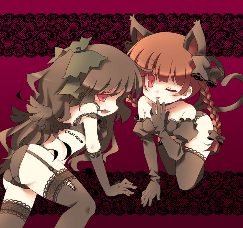 :p2girlsanimal earsblack hairbraidcat earscat girlcat tailelbow glovesfemale focusgarter beltgloveshair ribbonlacelace trimlingerielong hairmultiple girlsone eye closedpantiesred eyesred hairribbonshort hairtailtattoothighhighstonguetongue outtwin braidstwintailsunderwearwingswink