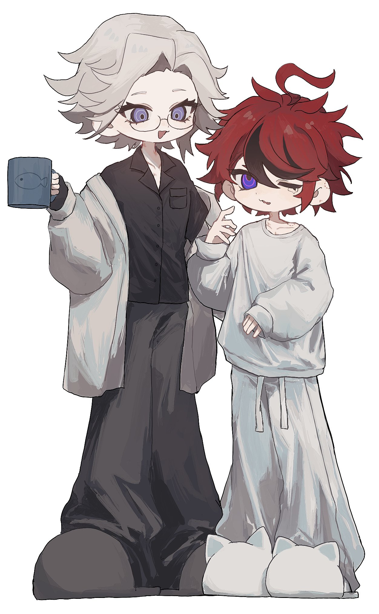 2boysahogealternate costumeanimal slippersblack glovesblack pantsblack shirtblack streaksblue eyesbreast pocketcoffee mugcollarbonecupdeformedfingerless glovesglassesglovesgrey hairholdingholding cuplooking at anotherlooking upmale focusmugmulticolored hairmultiple boysone eye closedopen mouthpantspocketpurple eyesred hairringed eyesshirtshort hairsimple backgroundslippersstreaked hairwhite backgroundwhite bathrobewhite pantswhite shirt