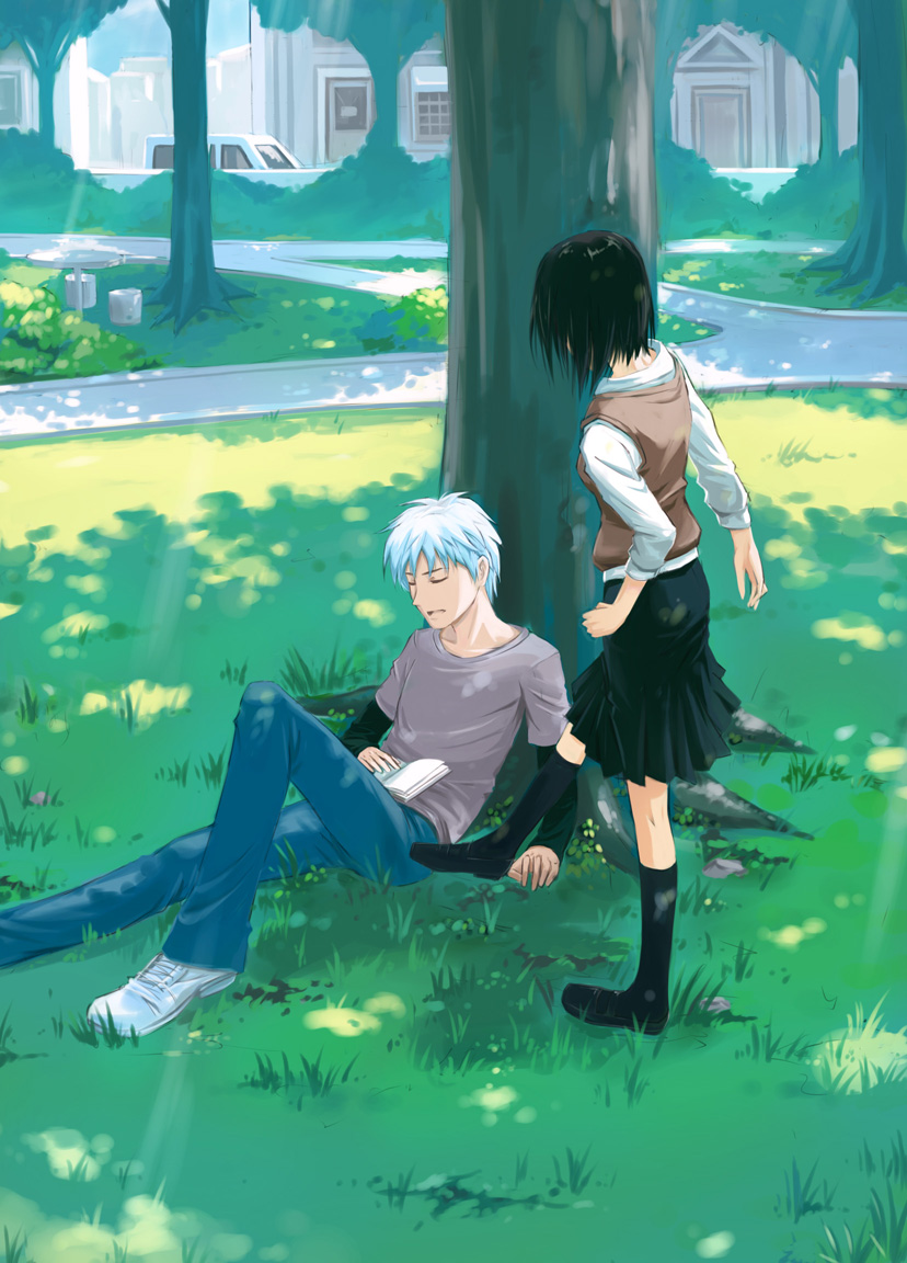 1boy1girlblack hairbookclosed eyesdappled sunlightkickingnatureoutdoorsschool uniformshort hairsittingskirtsleepingsockssunlighttreetree shadeunder treewhite hair
