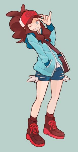 1girladjusting clothesadjusting headwearbagbaseball capblack bootsblue backgroundblue eyesblue jacketblue shortsbootsbrown bagbrown hairbrown sockscosplaydenimdenim shortsfull bodygrinhand in pockethandbaghathilbert (pokemon) (cosplay)jacketlong hairlong sleevesone eye closedpoke ball printponytailshort shortsshortssidelockssimple backgroundsmilesockssolo