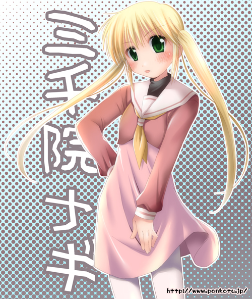 :p00sblonde hairblushdressgreen eyeshand on own hiphip focuslong hairschool uniformskirtskirt tugsolostandingthighhighstonguetongue outtwintailswhite thighhighs
