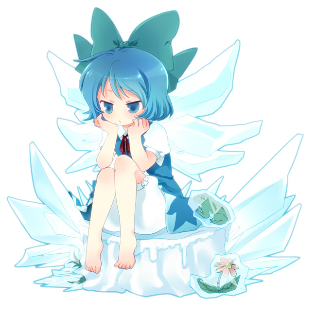 1girlbarefootbloomersblue eyesblue hairdressfeetfemale focusflowerfrogicematching hair/eyesplantshort hairsolounderwearwhite backgroundwings