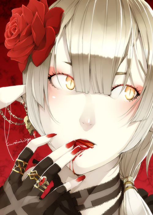 1girlbloodblood on faceblunt bangschokerearringseyeshadowfemale focusfingerless glovesflowergloveshair between eyeshair flowerhair ornamentjewelrylicking lipslipstickmakeupnail polishpale skinponytailportraitred backgroundred lipsred nailsringroseslit pupilssolotonguetongue outvampireyellow eyes