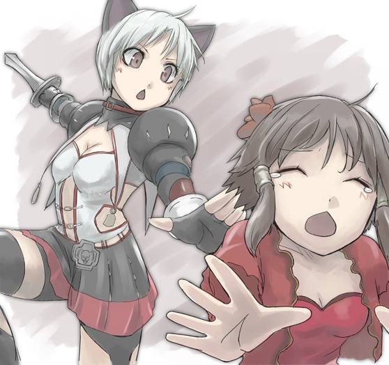 :o2girlsalternate colorbattleblack skirtbreastsbrown hairchestnut mouthcleavageclosed eyescollarboneflowerhair flowerhair ornamentholdingholding swordholding weaponmultiple girlsopen mouthshort hairskirtswordtearstriangle mouthweaponwince
