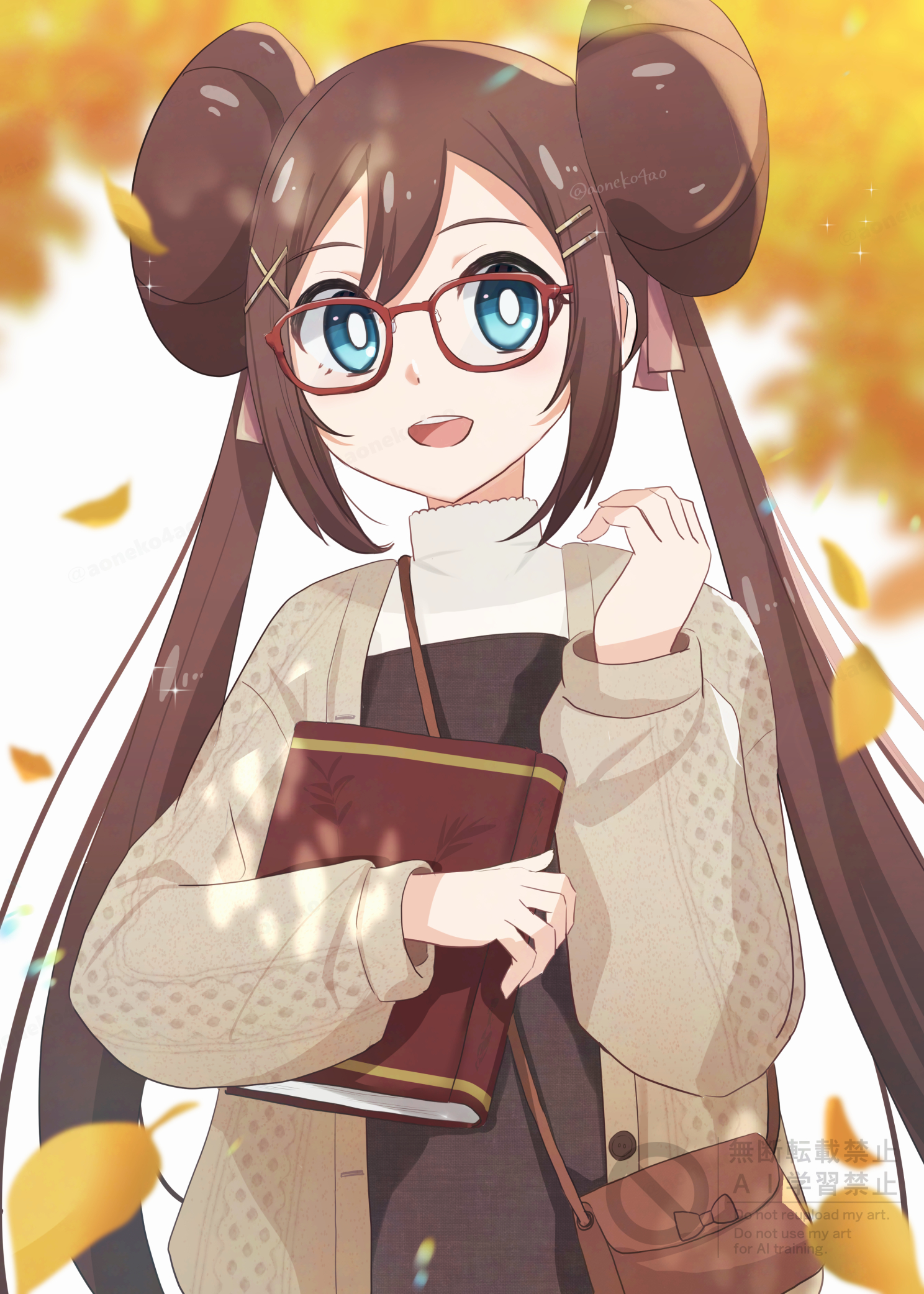 :d1girlalternate costumebagbespectacledblue eyesbookbright pupilsbrown bagbrown haircardigandouble bunfalling leavesglasseshair bunholdingholding bookleaflong hairlong sleevesopen cardiganopen clothesopen mouthoutdoorsshoulder bagsidelockssmilesoloteethtwintailsupper bodyupper teeth onlywatermarkwhite pupils