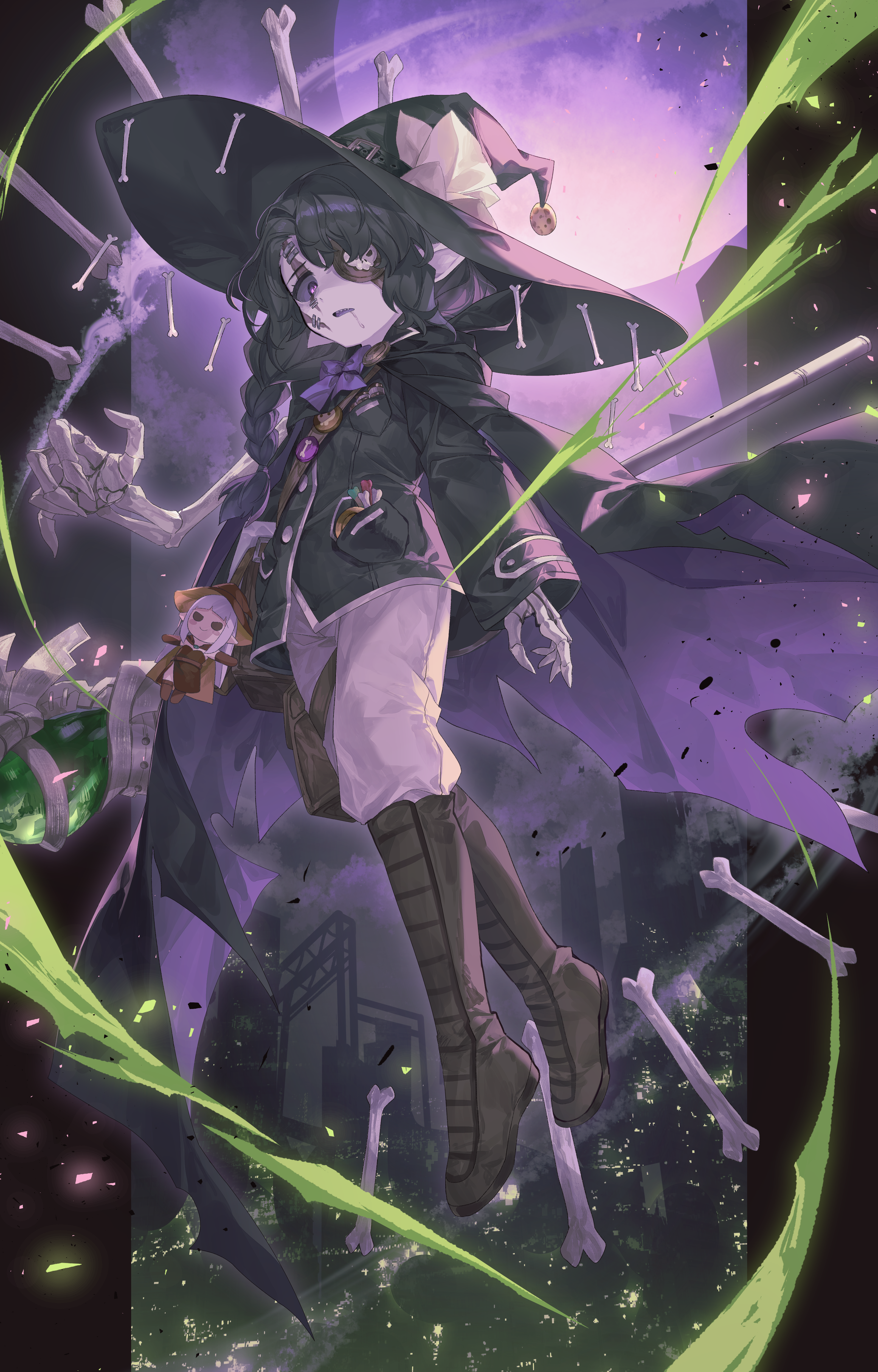 1girlblack hairblack jacketbonebowbowtiebraidbrown jacketcartoon bonecolored skinextra armseyepatchflat chestgrey skinhair over one eyehatholdingholding staffjacketlong sleevesmonster girlnecromancernightpantspointy earspuffy long sleevespuffy sleevespurple bowpurple bowtiesingle braidskeletal armskeletal handsolostaffstapledstapled faceundeadwhite pantswitch hatwizard