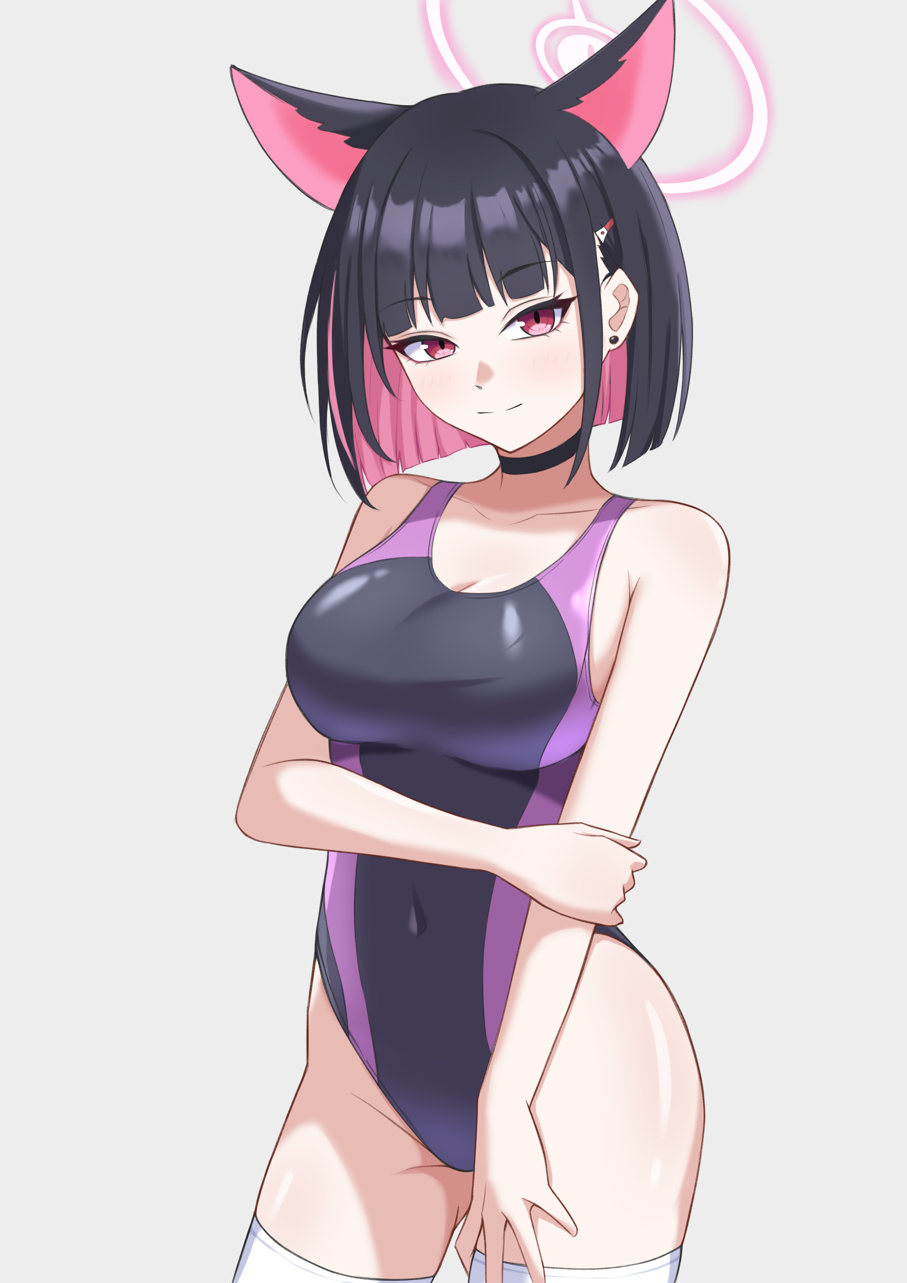1girlanimal earsblack hairblack one-piece swimsuitbreastscat earscolored inner haircompetition swimsuitcovered navelcowextra earshalohighleghighleg one-piece swimsuitlooking at viewermedium breastsmulticolored hairone-piece swimsuitpink hairpink halored eyesshort hairsoloswimsuitthighhighstwo-tone hairtwo-tone swimsuitwhite thighhighs