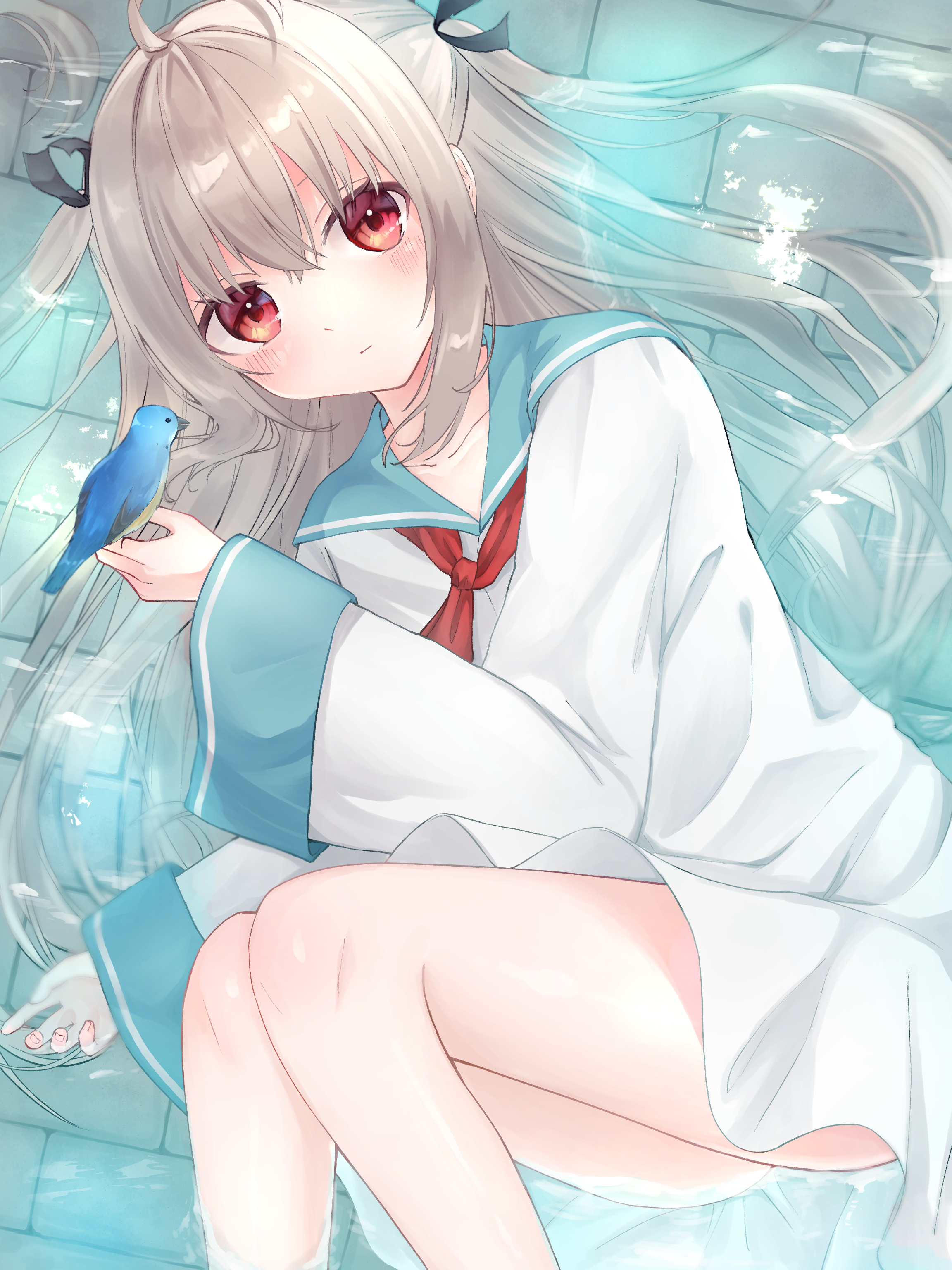 1girlahogeascotbirdbird on handblack ribbonblue birdblue sailor collarblushclosed mouthdressdutch angleexpressionlesseyebrows hidden by hairfeet out of framehair between eyeshair ribbonhair spread outhand upknees uplong hairlong sleeveslooking at viewerlyingon sidered ascotred eyesribbonsailor collarsailor dressshort dresssidelockssolotwo side upvery long hairwaterwhite dresswide sleeves
