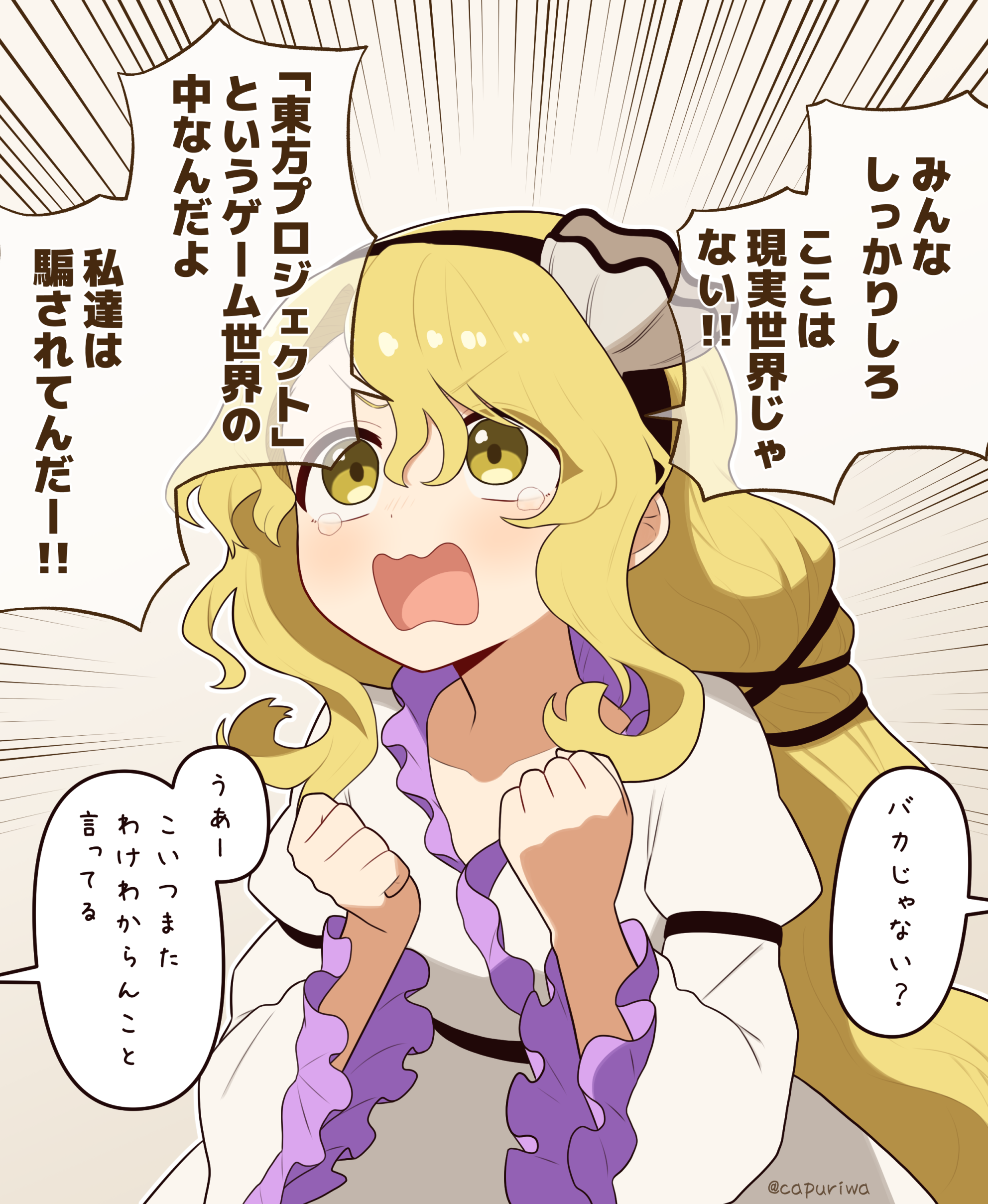1girlblack hairbandblonde hairclenched handsdressemphasis linesfourth wallfrilled dressfrilled sleevesfrillshair ornamenthairbandlong hairlong sleevesopen mouthshellshell hair ornamentsolospeech bubbletearing uptwitter usernamevery long hairwhite dresswide sleevesyellow eyes