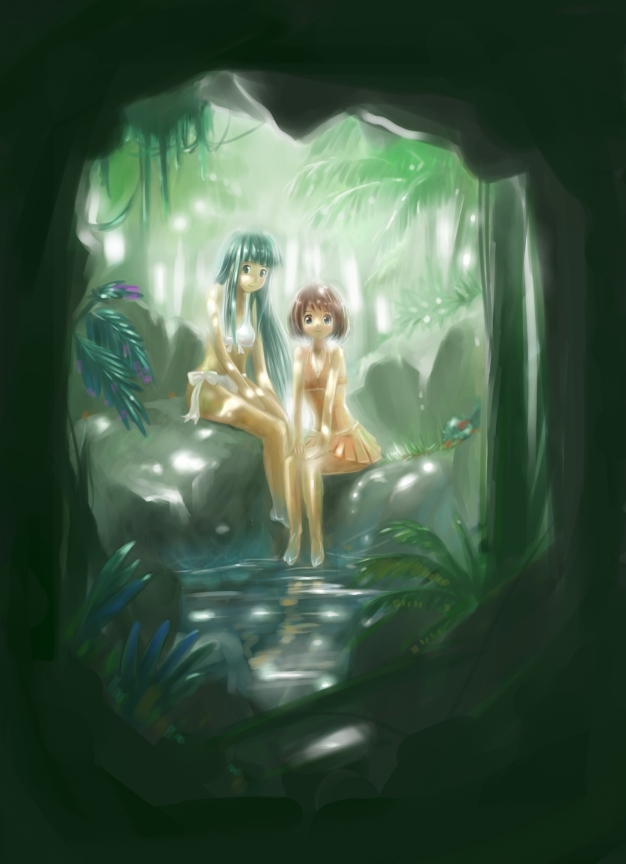 2girlsbarefootbikiniblue eyesbrown haircavegreen eyesgreen hairlong hairmultiple girlsnaturerocksittingsoaking feetswimsuitwater