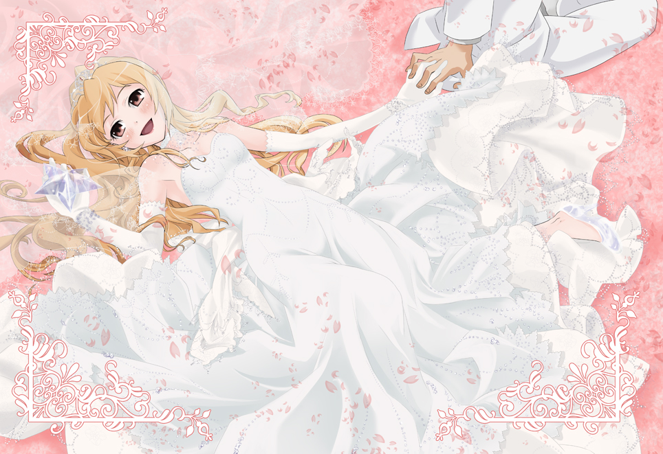 00sblushbridal veilbridebrown eyesbrown haircherry blossomsdresselbow glovesgloveshappyholding handslipsticklong hairlyingmakeuppetalssolo focusstar (symbol)tiaraveilwedding dress