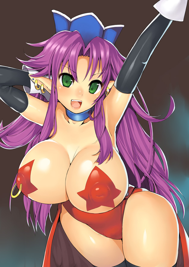 1girlareola piercingarmpitsblack thighhighsbreastschokercovered erect nipplesearringselbow glovesfemale focusglovesgreen eyeshathuge breastsinverted nipplesjewelryleotardlong hairnipple piercingnipple ringsnipplesopen mouthpastiespiercingpiercing through clothespointy earspurple hairsolostar (symbol)star pastiesthighhighstopless female