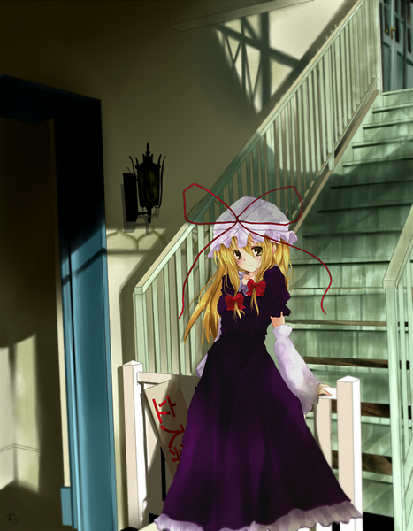 1girlblonde hairbowdetached sleevesdressfemale focushair bowhathat ribbonindoorsribbonsolostairs