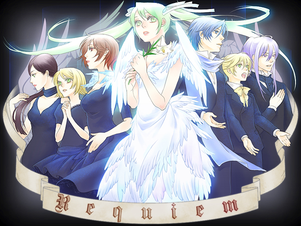 3boys4girlsangel wingsblack hairblonde hairblue eyesblue hairbrown hairdressflowerformal clothesgreen eyesgreen hairhair ribbonmultiple boysmultiple girlsown hands claspedown hands togetherpurple eyespurple hairred eyesribbonsong nametwintailswhite dresswings