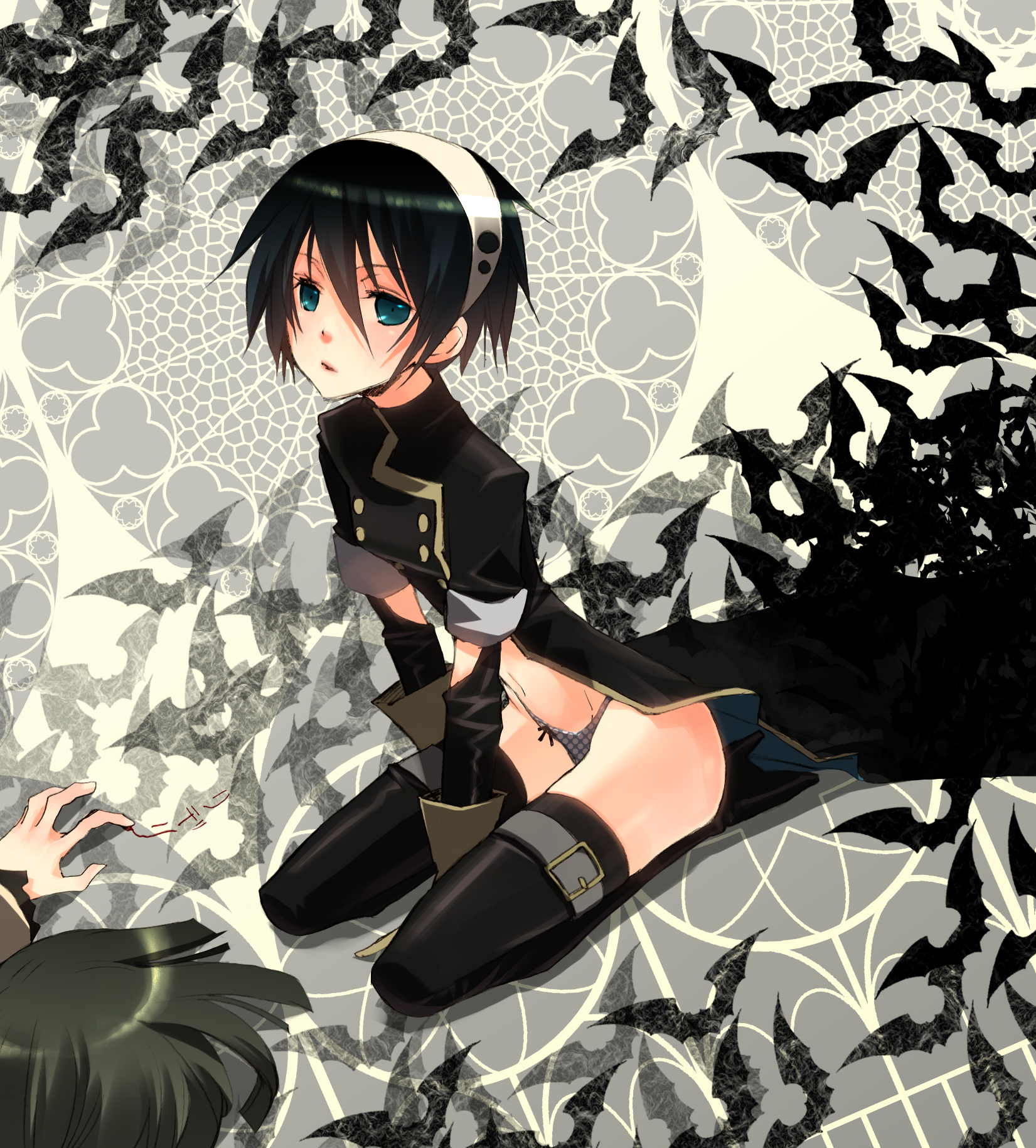 1girlbat (animal)black hairblack pantiesblue eyesbucklehigh heelskneelinglong coatpantiespolka dotpolka dot pantiesshoesshort hairsolo focusthighhighsunderwear