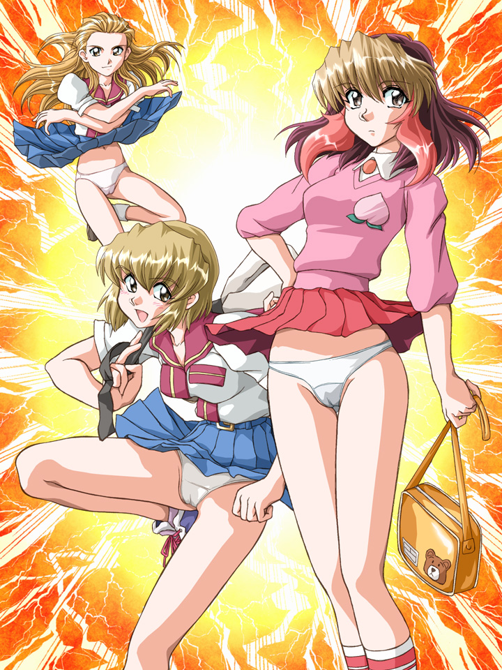 3girlsbagbearblonde hairbrown eyescameltoefoodfruitmulticolored hairmultiple girlspantiespantyshotpeachpleated skirtschool uniformskirtsweaterunderwearwhite pantieswindwind lift