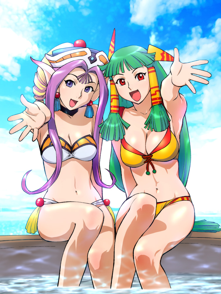 2girlsbad anatomybikinichokerdayelfgreen hairhair tubeshead tiltlong hairmultiple girlspointy earspurple hairswimsuitwater