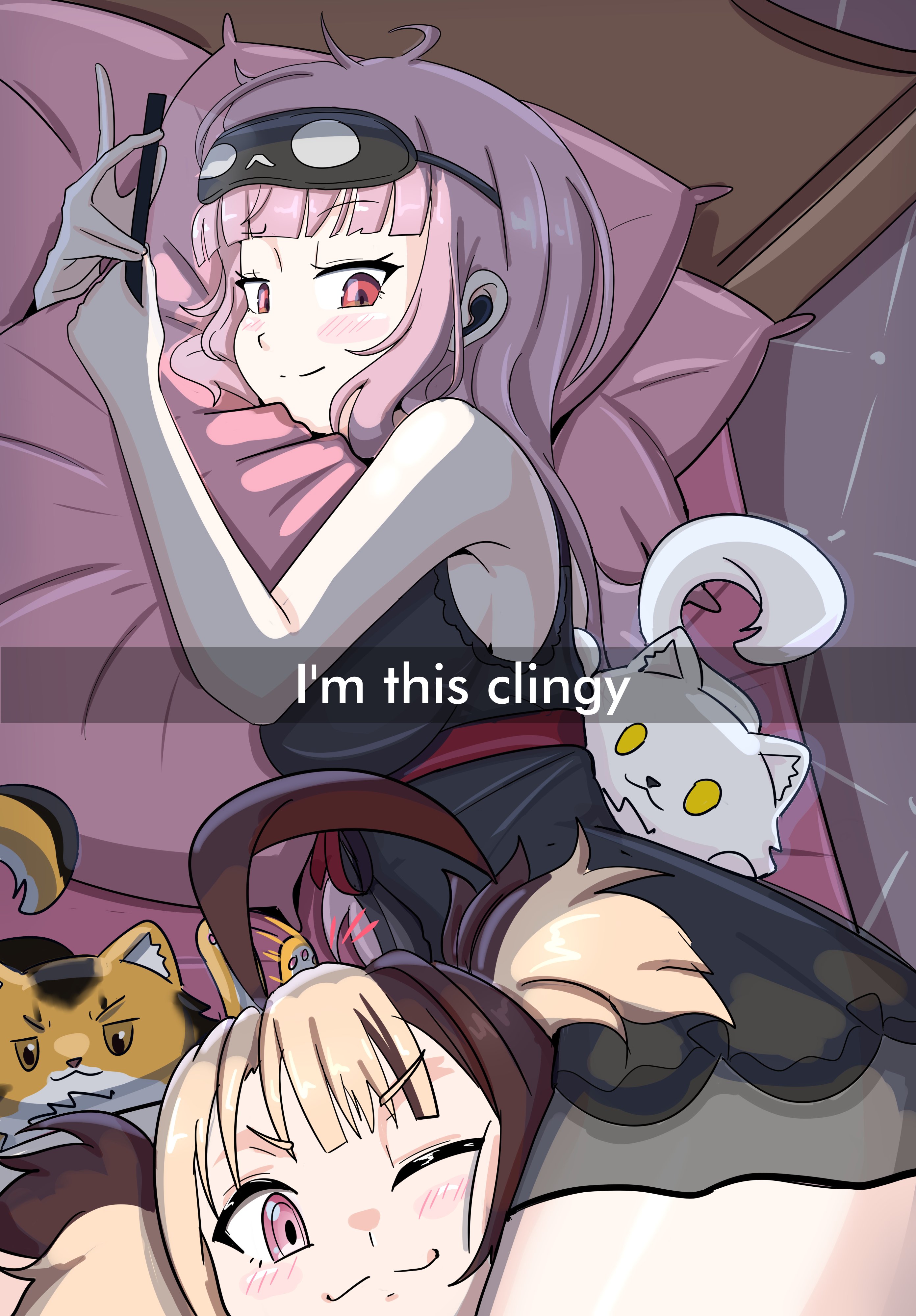 2girlsahogebetween thighsblack nightgownblushcatcellphonehead between thighshead on pillowholdingholding phonei'm this clingy (meme)long hairlyingmememultiple girlsnightgownofficial alternate costumephonepillowpink eyespink hairred eyesscreen lightsmartphonesmiletutu (mori calliope)virtual youtuberyuri
