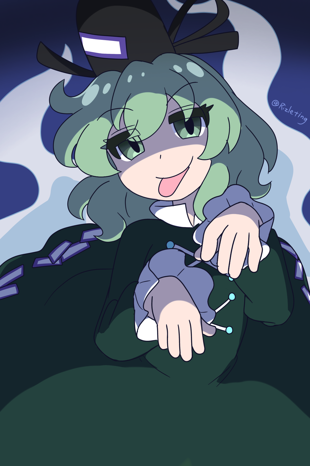 1girlblack hatblue backgrounddressghost tailgradient backgroundgreen dressgreen hairhatlong sleeveslooking at viewerofudaofuda on clothesshort hairsolotate eboshitonguetongue outtwitter username