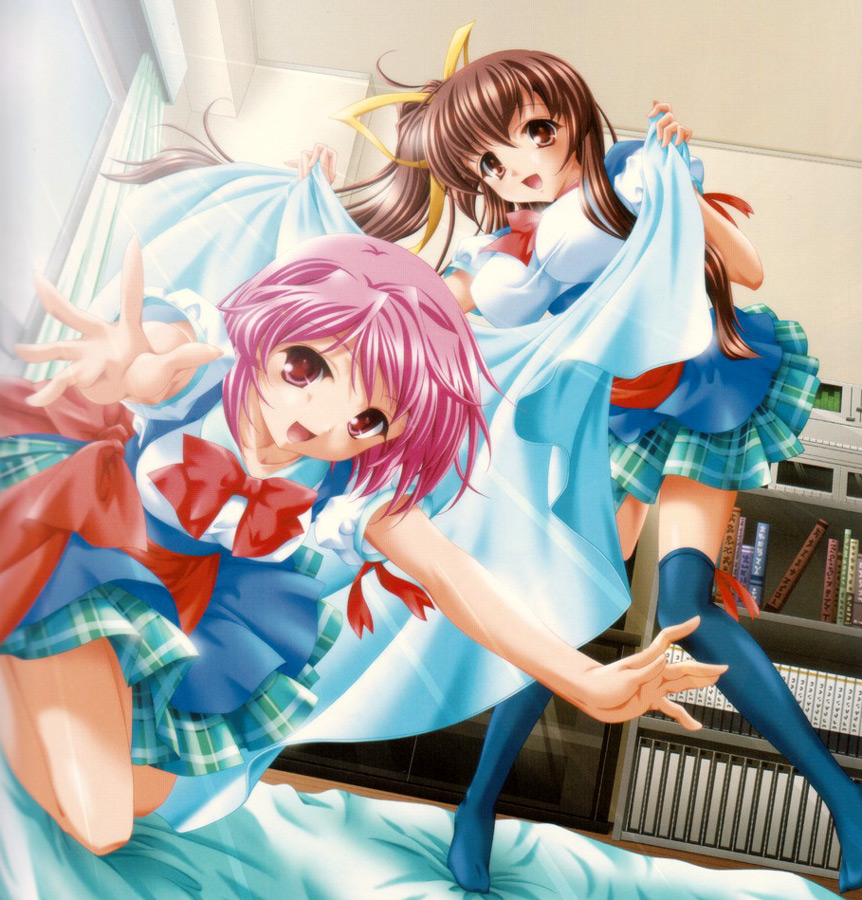 2girlsblushbrown hairmultiple girlspink hairplaid clothesplaid skirtribbonschool uniformskirtthighhighs