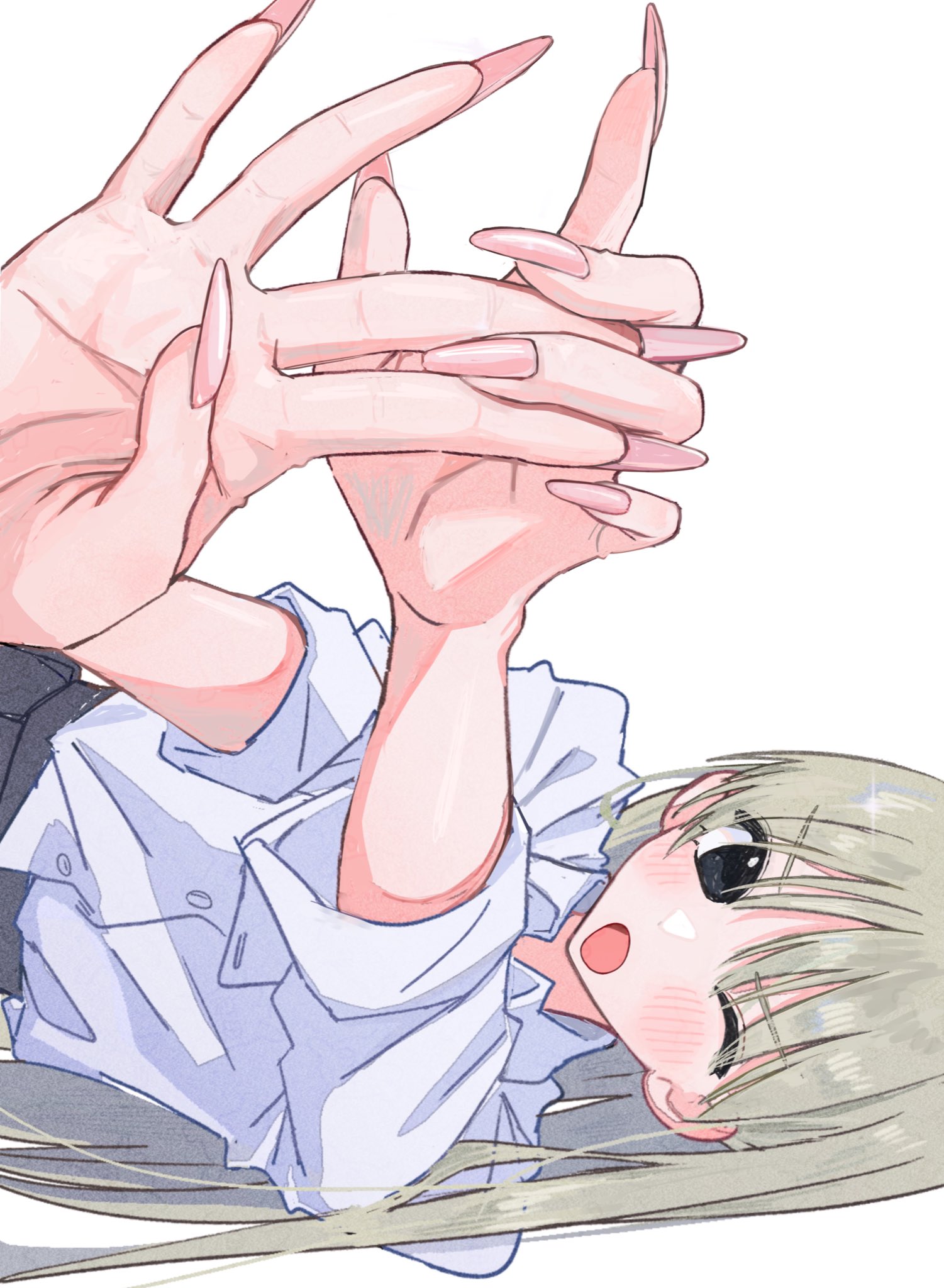 :o1girlblack eyesblonde hairblushchoppy bangscollared shirtfingernailsforeshorteninghand focusinterlocked fingerslong hairlong sleeveslooking at viewernail polishone eye closedopen mouthpink nailspleated skirtschool uniformshirtsimple backgroundskirtsoloupper bodyvery long fingernailswhite backgroundwhite shirt