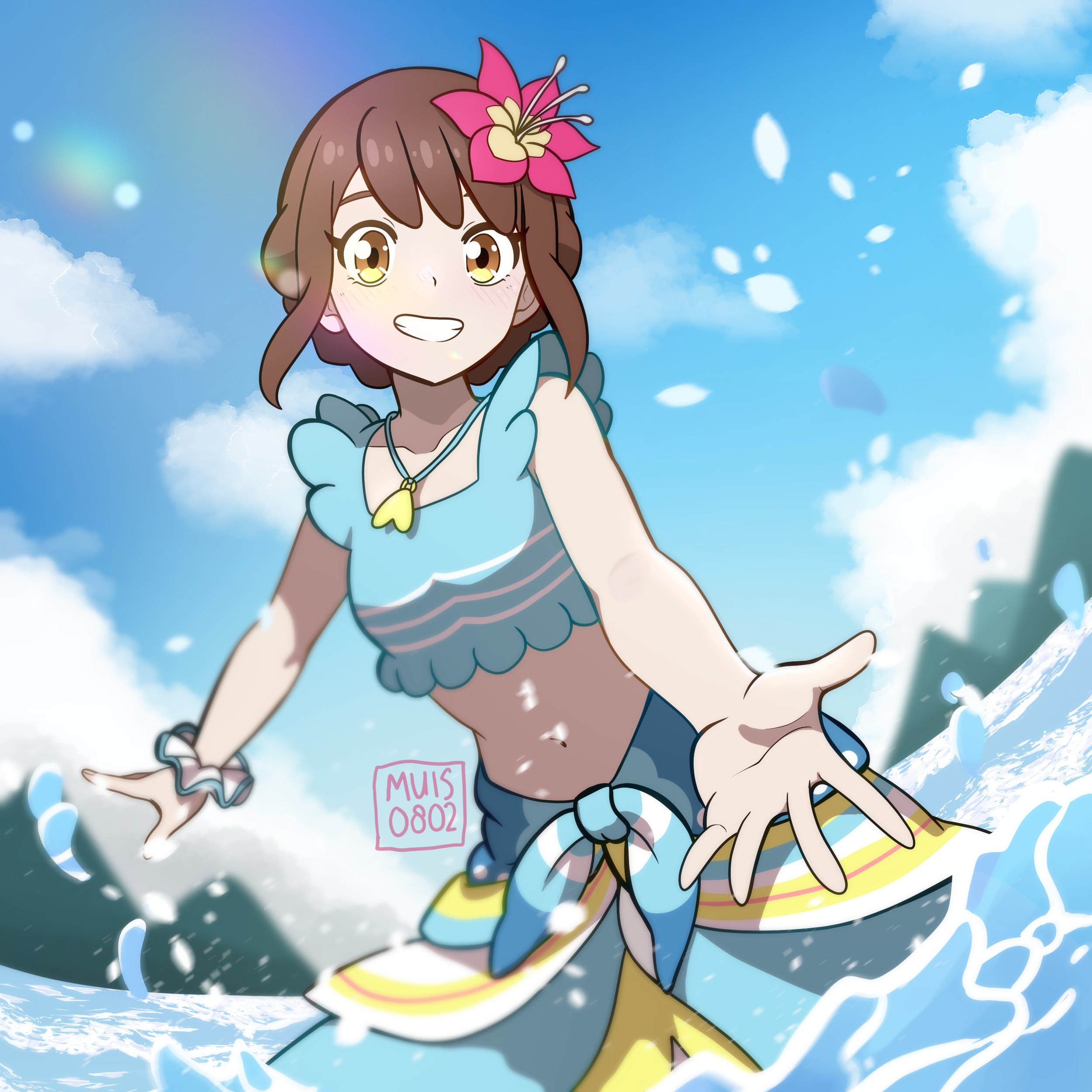 1girlblue shirtbraceletbrown eyesbrown hairclouddayflowergrinhair flowerhair ornamenthappyjewelrylooking at viewernecklaceofficial alternate costumeoutdoorspink flowersarongscrunchieshirtsignatureskysleevelesssleeveless shirtsmilesolosplashingspread fingersteethwadingwaterwrist scrunchie
