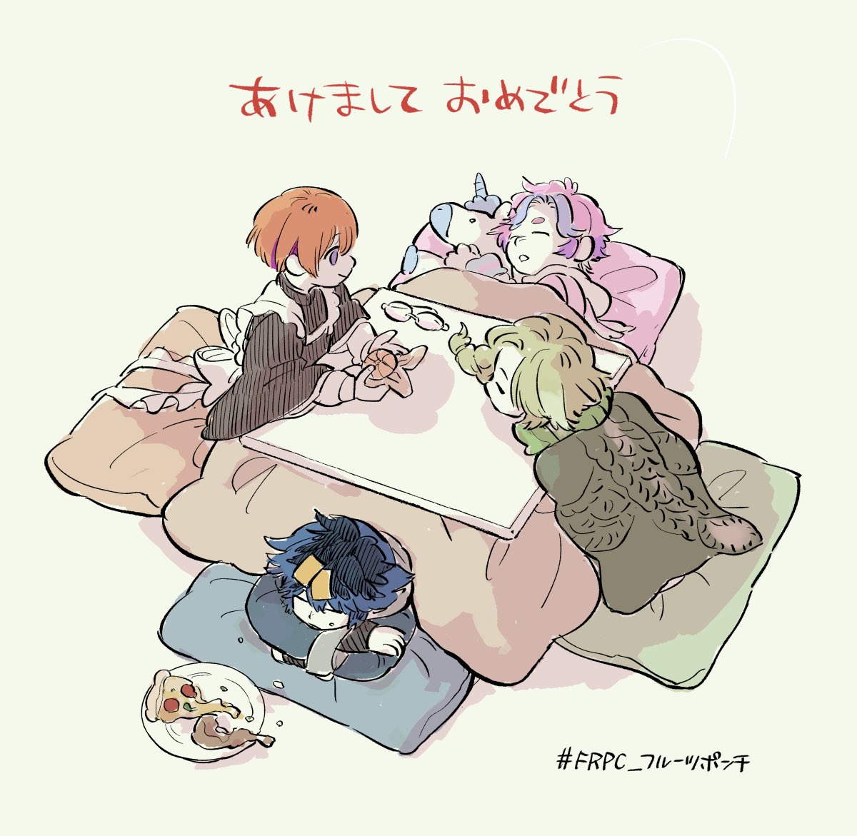 4boysano amesukeblack hairblanketblue eyesbraidclosed eyesfoodfood on facefruitgreen hairhashtagkotatsulyingmale focusmandarin orangemulticolored hairmultiple boyson sideon stomachorange hairpillowpink hairpizzaplatepurple eyespurple hairsittingsleepingstreaked hairstuffed unicorntabletwo-tone hairunder kotatsuunder table
