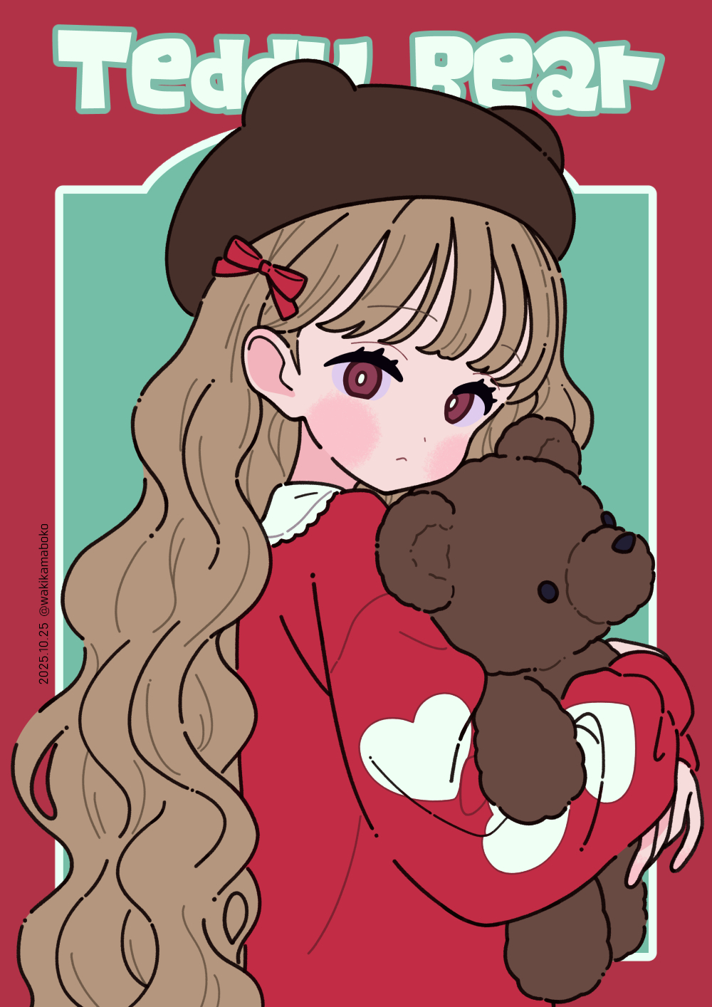 1girlanimal earsanimal hatbear earsberetborderbowbrown eyesbrown hairbrown hatclosed mouthdatedenglish textfake animal earsfrom sidegreen backgroundhair bowhatlong hairlong sleeveslooking at viewerlooking to the sidepuffy long sleevespuffy sleevesred borderred bowred shirtshirtsolostuffed animalstuffed toyteddy beartwitter usernameupper bodyvery long hair