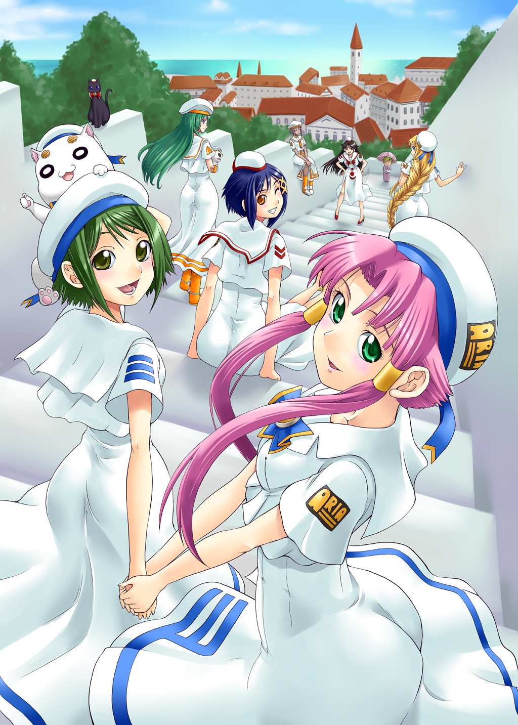 00s6+girlsaria company uniformberetblack catblonde hairblouseblue hairbrown eyescatdresseveryonegreen eyesgreen hairhathimeya company uniformmultiple girlsorange planet uniformpink hairshirtsidelocksstairswhite catwhite shirtwide hips
