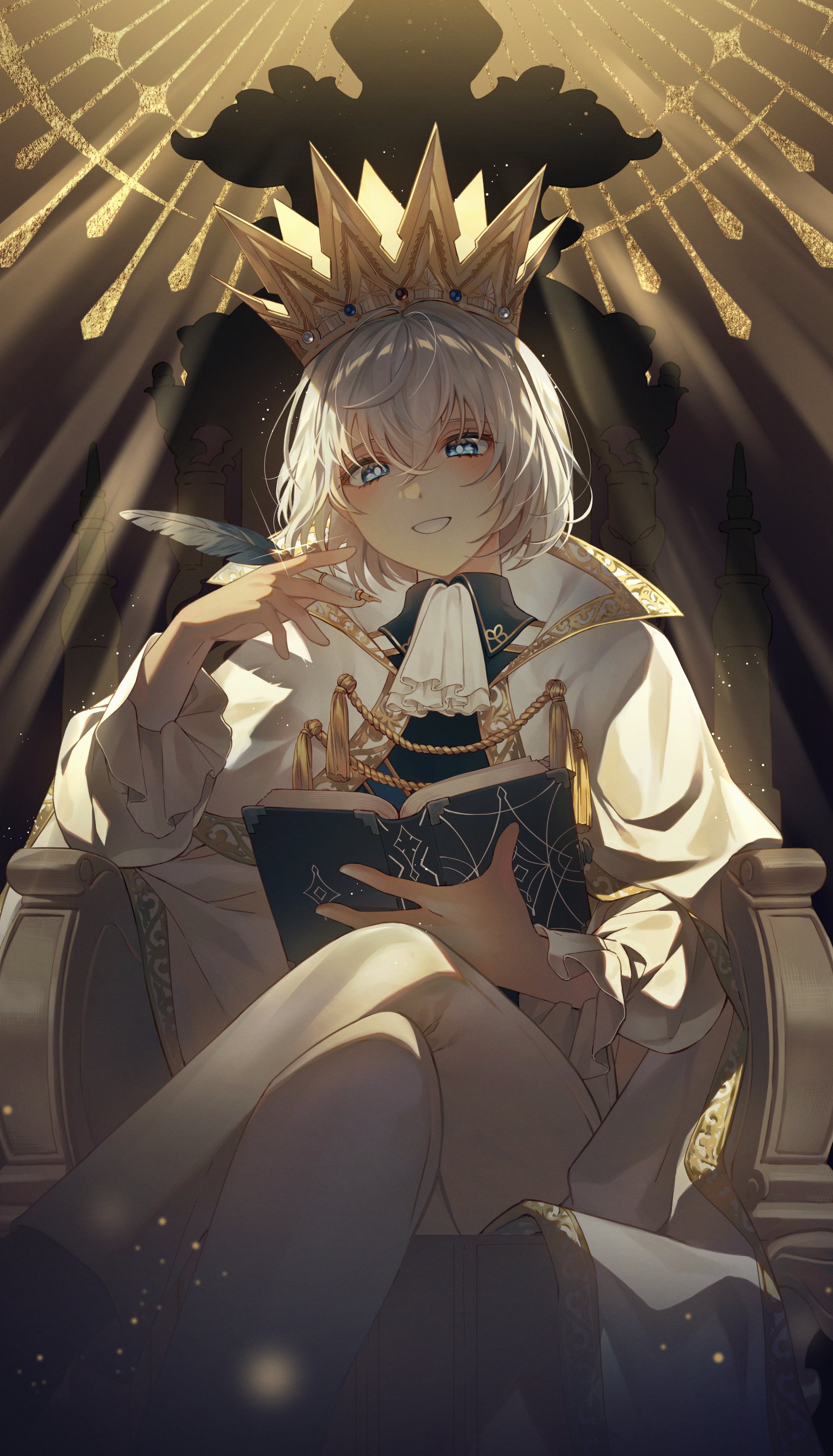 1boyascotblue eyesblushbookcapecrossed legscrowndark skindark-skinned malegrey hairgrinhair between eyesholdingholding booklong sleeveslooking at viewermale focusofficial alternate costumeopen bookpantsshort hairsitting on thronesmilesolothronewhite ascotwhite capewhite pants