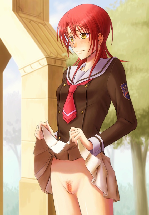 blushfemaleFlag for Deletionkiniro no korudalong hairno pantiesoutdoorspubic hairpussyred hairschool uniformskirt liftsolostandinguncensoredyellow eyes
