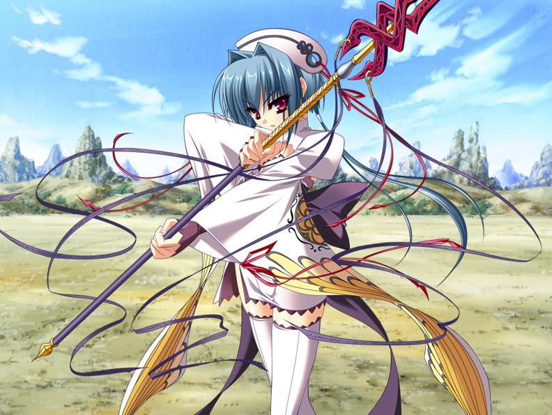 00s1girleyes visible through hairfemale focusfighting stancegreen hairhair ornamentnarrowed eyespink eyespolearmribbonsolothighhighsweaponzettai ryouiki