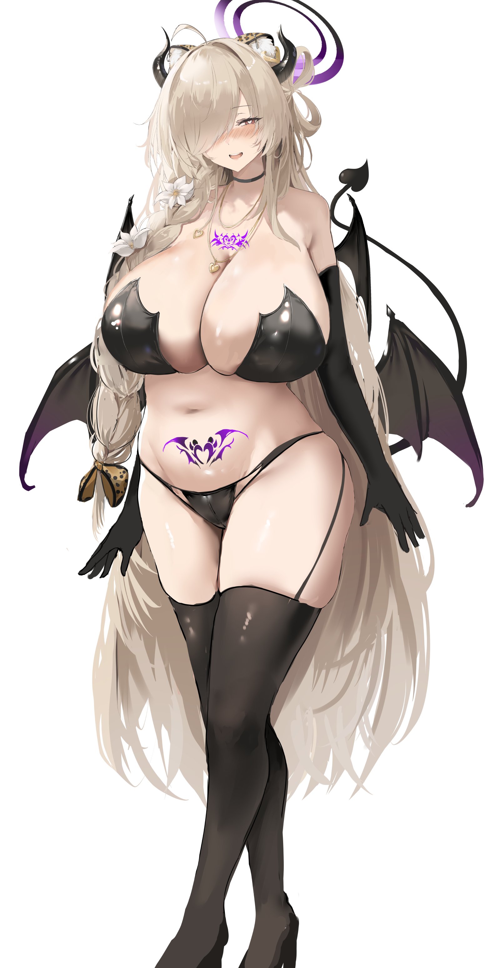 1girlanimal ear fluffanimal earsbare shouldersblack chokerblack glovesblack hornsblack pantiesblack thighhighsblack wingsblonde hairbreastschest tattoochokerdemon girldemon hornsdemon taildemon wingselbow glovesgloveshair over one eyehaloheartheart necklaceheart-shaped pupilshornshuge breastsjewelrylong hairlooking at viewerlow wingsnavelnecklaceone eye coveredpantiespubic tattoopurple halosimple backgroundsmilesolostandingstomachsymbol-shaped pupilstailtattoothighhighsunderwearwhite backgroundwings