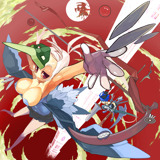 armpitsbare shouldersbreastscleavageforeshorteninggloveslarge breastsmaskred eyesskysolotenguwhite hairwings