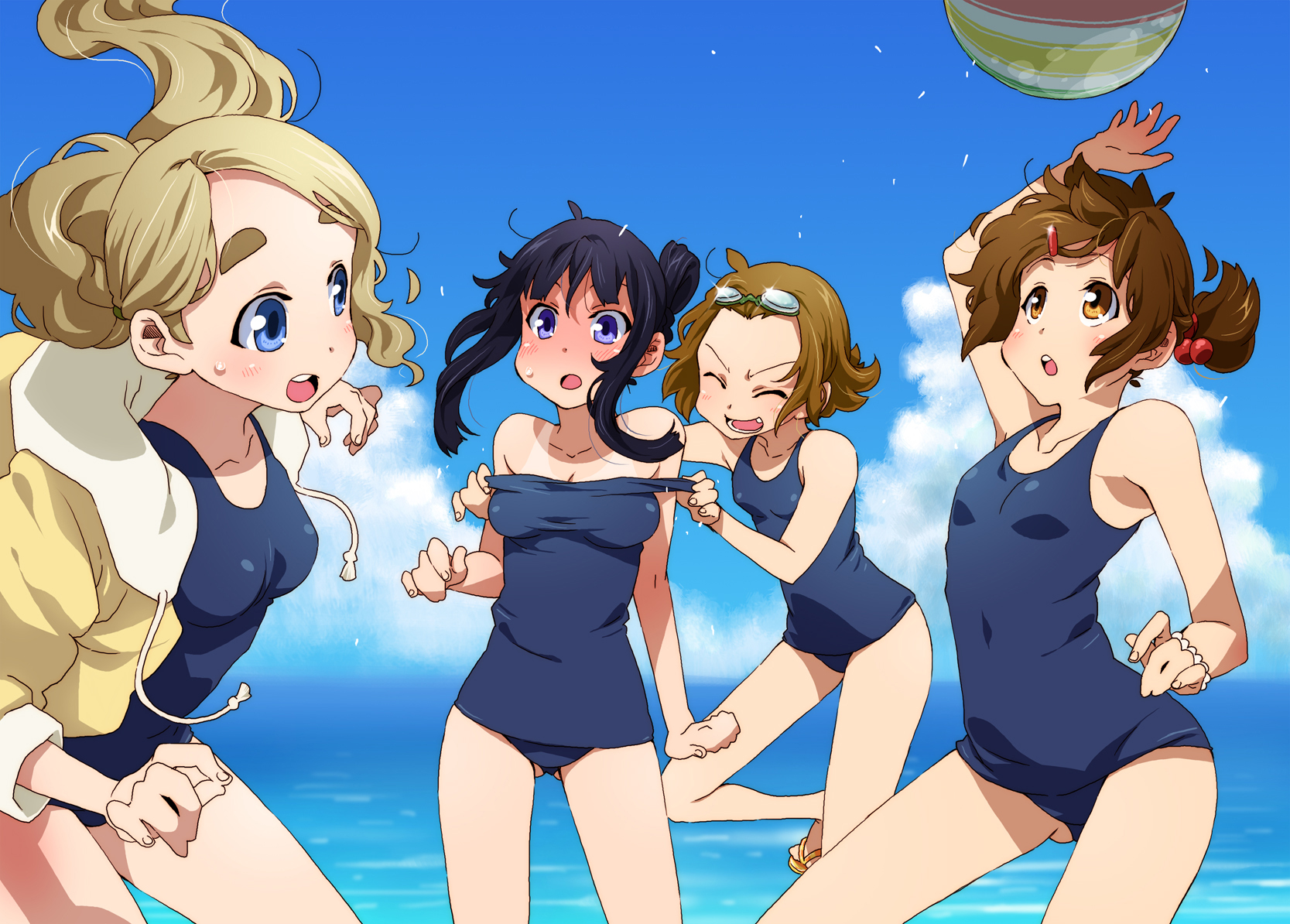 tsuutenkaaku, angry, bikini, blush, breasts, detached sleeves, greyscale, large breasts, long hair, monochrome, outline, solo, sweat, swimsuit, thighhighs