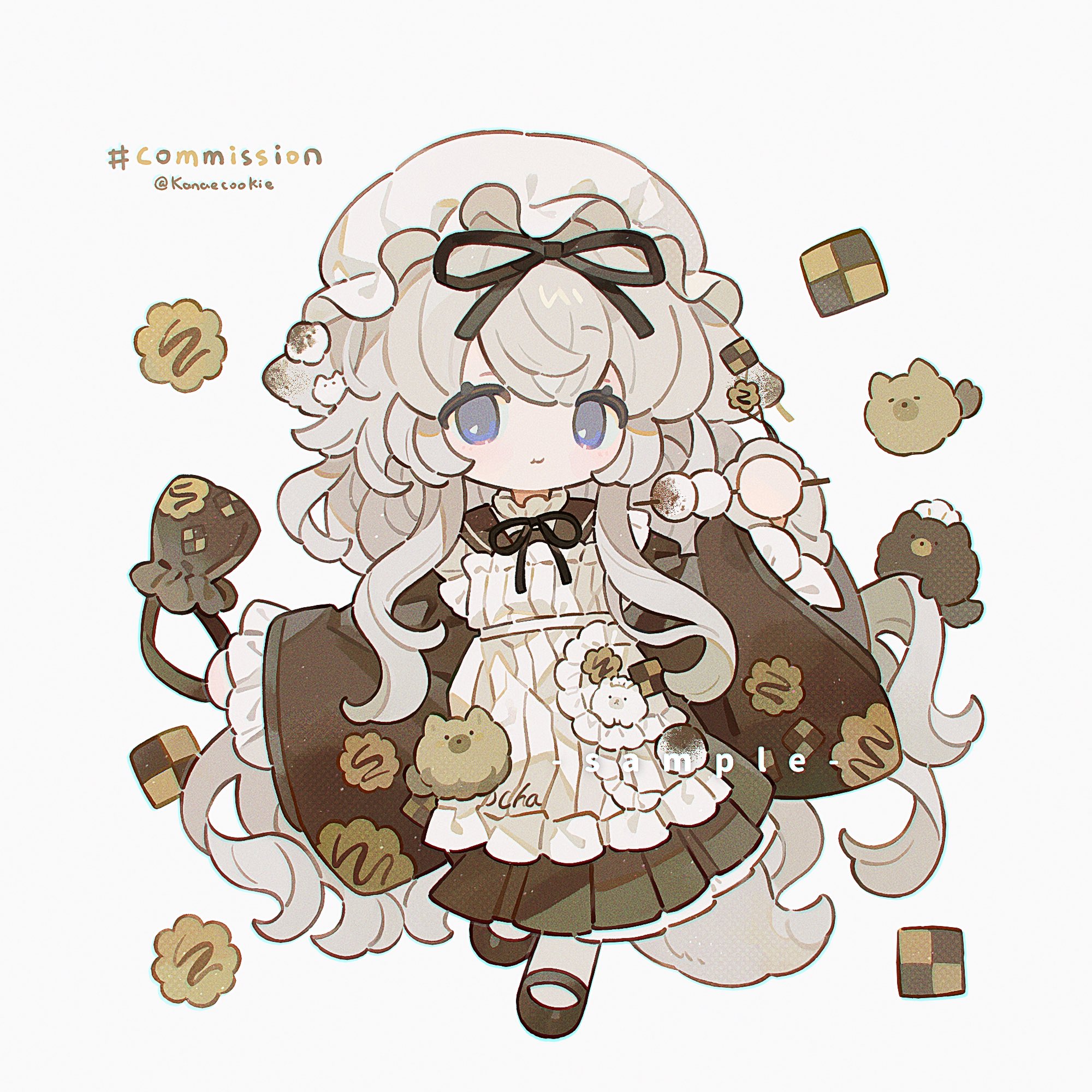 1girlapronball handsblue eyesbrown kimonobrown shoescheckerboard cookiechibichibi onlyclosed mouthcookiedangofoodfrilled apronfrillsfull bodygrey hairhair ribbonhatholdingholding foodjapanese clotheskimonolong hairlong sleeveslooking at viewermob capneck ribbonribbonshoessimple backgroundsolostandingtwitter usernamewagashiwhite apronwhite backgroundwhite hatwide sleeves