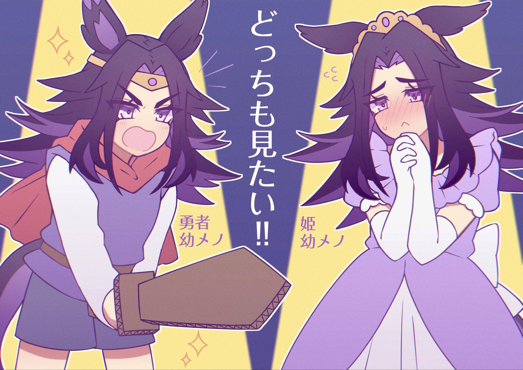 1girlanimal earsblack hairblushcapecircletclosed mouthdresselbow glovesflipped hairfrownglovesholdingholding swordholding weaponhorse earshorse girlhorse taillong sleevesmulticolored hairopen mouthpurple dresspurple eyespurple hairpurple shortspurple tunicred capeshort sleevesshortsspotlightswordtailtiaratunicweaponwhite gloveswooden sword
