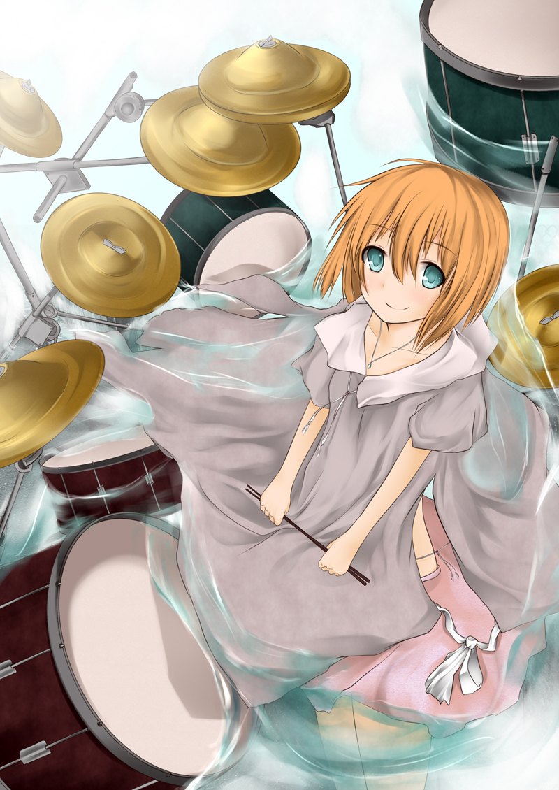 1girlaqua eyesdrumdrum setdrumsticksfemale focusfrom aboveinstrumentjewelryorange hairpendantshort hairsmilesolosubmergedwadingwater