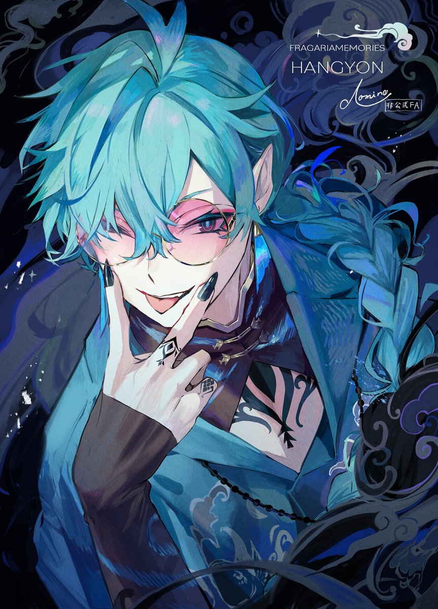 1boyahogeartist namebeadsblack nailsblue eyesblue hairblue shirtbraidcharacter namechest tattoocollared shirtdress shirtearringseyeshadowfangfinger tattoohair between eyeshair over shoulderinward vjewelrylong hairlong sleeveslooking at viewermakeupmale focusone eye closedpointy earsround eyewearshirtsingle braidsleeves past wristsswirltattootonguetongue outv