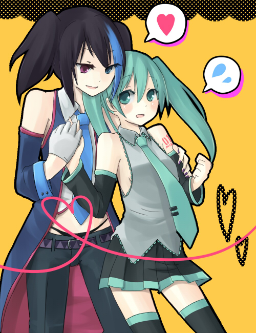 2girlsaqua eyesaqua hairaqua necktieblack hairblue eyesblue necktieblushcrossoverdetached sleevesglovesheartheight differenceheterochromiaholding handslong hairmultiple girlsnail polishnecktiepantsred eyessingle glovesize differenceskirtsmilespeech bubblespoken heartspoken sweatdropsweatsweatdropthighhighstwintailsyuri