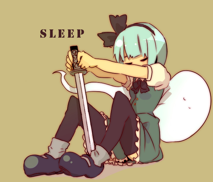 1girlblack thighhighsblue hairblunt bangsbob cutclosed eyesenglish textfemale focushairbandhitodamamary janesoutstretched armsshoessittingskirtsleepingsoloswordtext focusthighhighsweapon