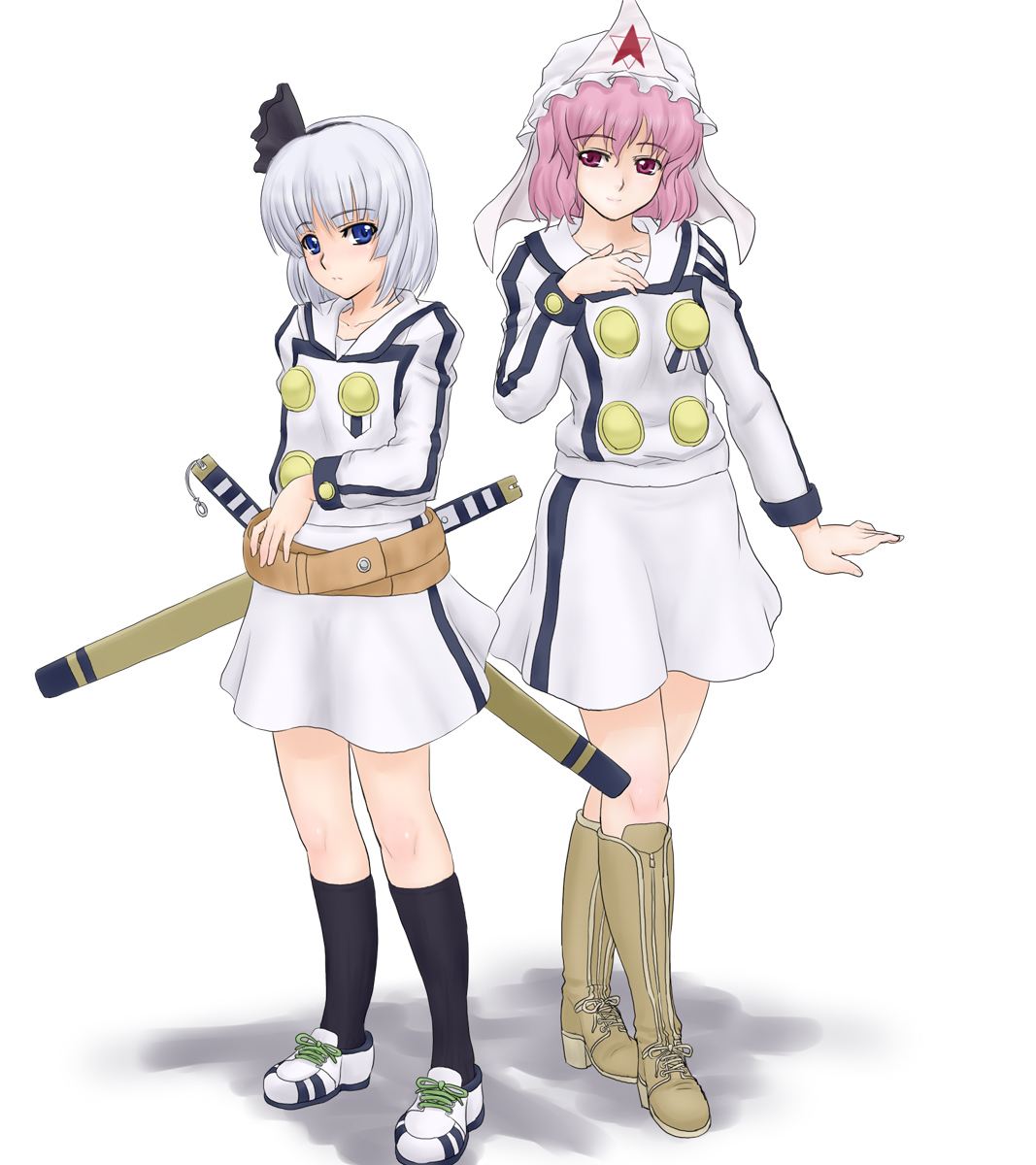 raito taisha, asakura karen (heaven burns red), toujou tsukasa, heaven burns red, commentary, highres, symbol-only commentary, 2girls, animal ears, black boots, black hair, black pantyhose, blazer, blonde hair, blue eyes, blue jacket, boots, bow, bowtie, brown skirt, cat, cat ears, cat tail, different reflection, grey sweater, hood, hooded jacket, jacket, leaning on person, multiple girls, open clothes, open jacket, pantyhose, plaid clothes, plaid skirt, red bow, red bowtie, reflection, school uniform, sitting, skirt, sleeves past wrists, sweater, tail, yellow jacket, yuri