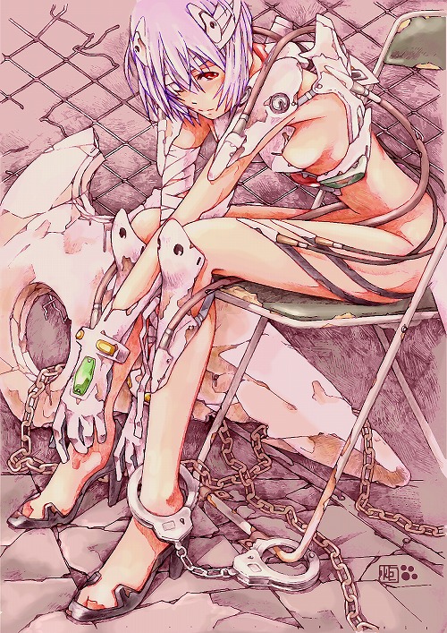 1girlbandage over one eyebandagesbdsmbent overblue hairbondageboundbreastscablechainchain-link fencechaircuffsfemale focusfencefolding chairhandcuffshigh heelshunched overlegsmecha pilot suitplugsuit (evangelion)purple hairred eyesruinssceneryshoesshort hairsideboobsignaturesittingsketchskullsolothighhighstorn clotheswire