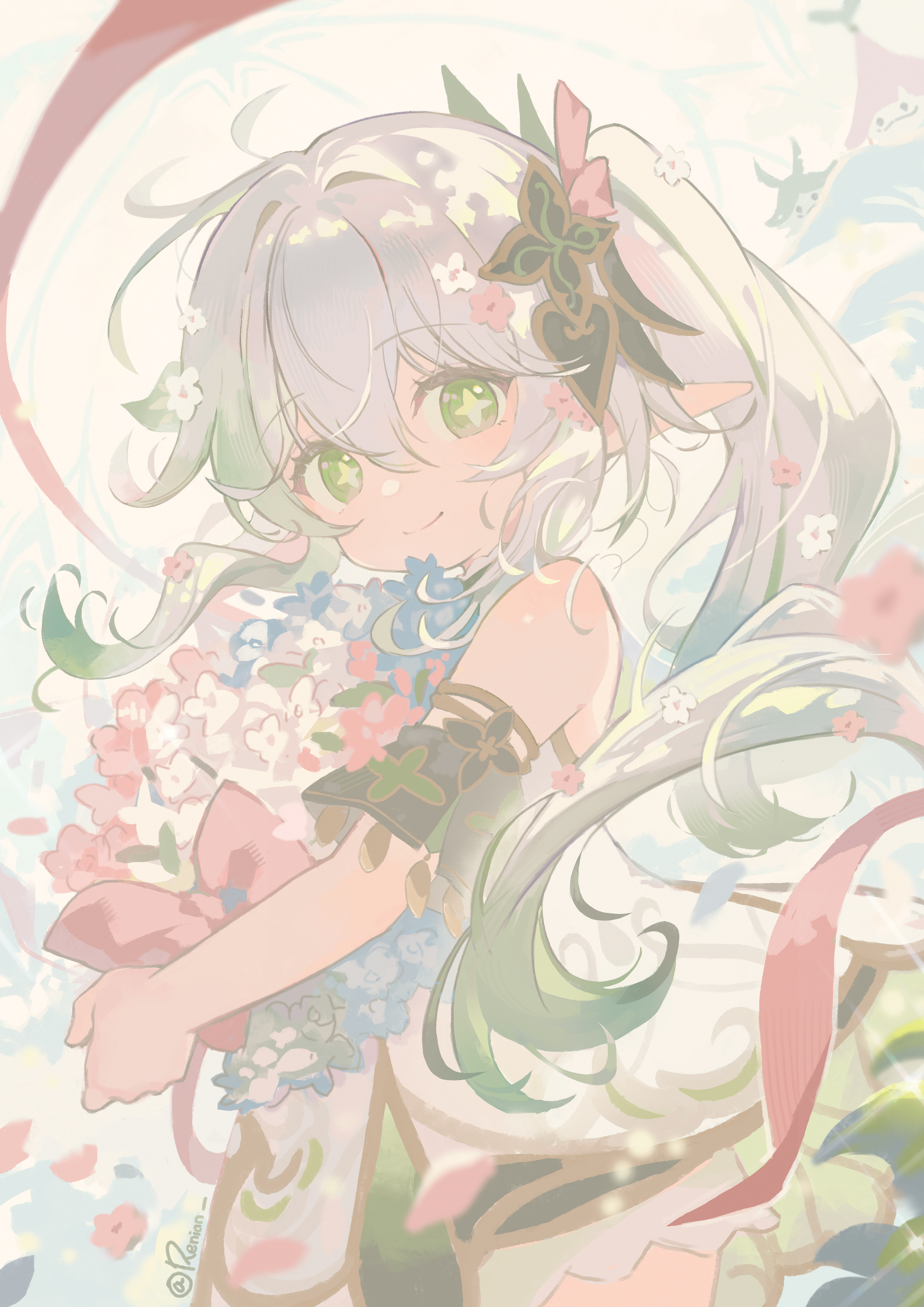 1girlbare shouldersbloomersblue flowerbouquetclosed mouthdetached sleevesdressflowerfrom sidegold trimgradient hairgreen eyesgreen hairgreen sleeveshair between eyeshair ornamentholdingholding bouquetleaf hair ornamentlong hairlooking at viewermulticolored hairpointy earsred flowerside ponytailsleevelesssleeveless dresssmilesolostar (symbol)star-shaped pupilssymbol-shaped pupilsunderwearwhite bloomerswhite dresswhite flowerwhite hair