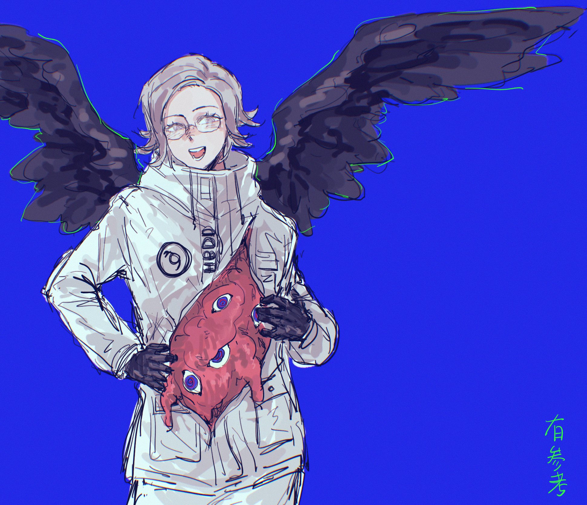 :d1boyadjusting clothesblack glovesblack wingsblue backgroundblue eyesbody horrorcowboy shoteldritch abominationextra eyesfeathered wingsglassesglovesgrey eyesgrey hairistelchr21811jacketlooking at viewermale focusopen mouthringed eyesshort hairsimple backgroundsmilesolowhite jacketwings
