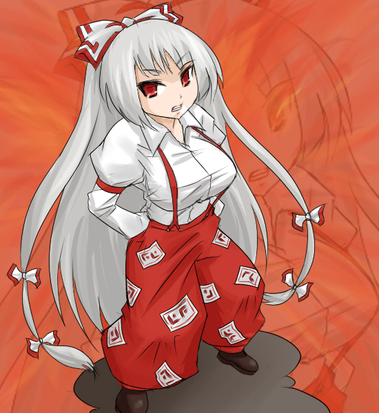 1girlbaggy pantsbowbreastsdress shirtfemale focushair bowhair ribbonlarge breastslong hairlooking at viewermultiple hair bowspantsred eyesribbonscowlshirtsolostandingtaut clothestaut shirtvery long hair