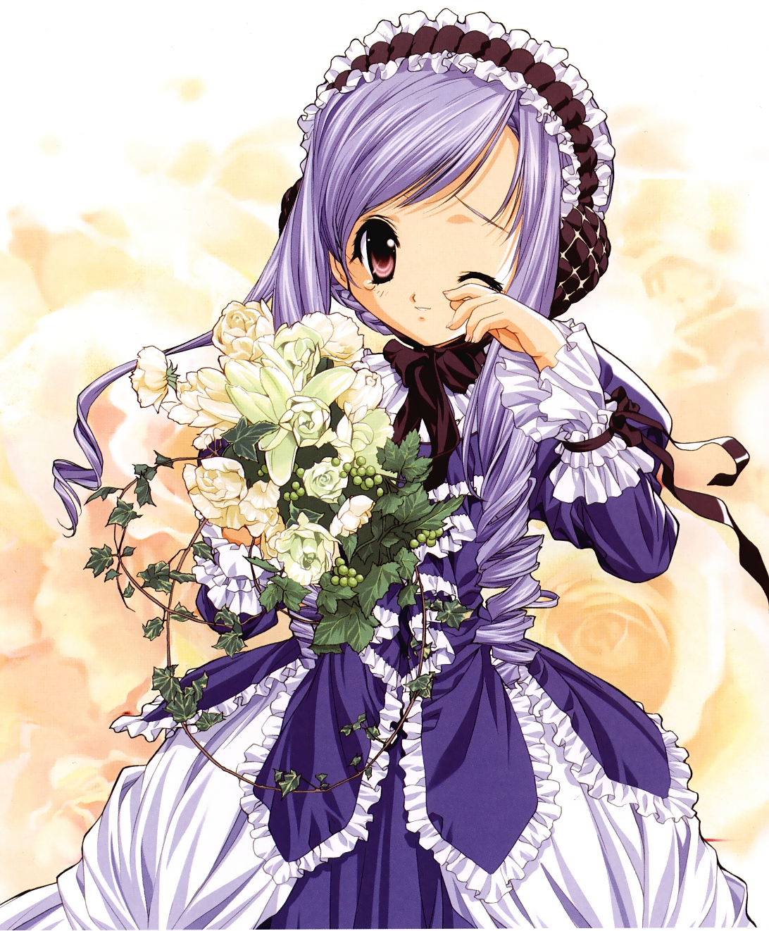 00s1girlbouquetchin strapdressdrill hairfemale focusfloral backgroundflowerfrilled dressfrilled sleevesfrillshairbandlolita fashionlolita hairbandlong hairlong sleeveslooking at viewerone eye closedplantpurple hairred eyesrosesolotearsvineswhite flowerwhite rosewiping tears